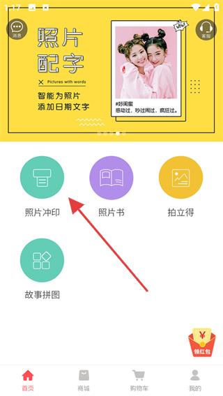 1、打開口袋沖印,在首頁點擊【照片沖印】功能,進入沖印服務頁面。