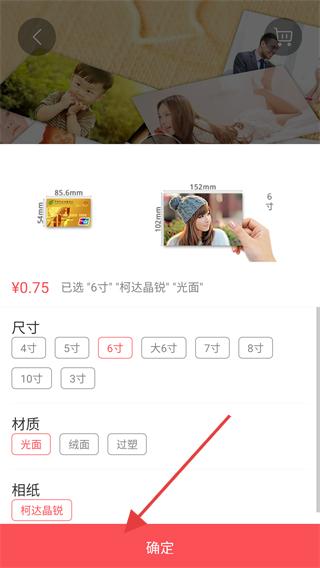 3、點擊【選擇】按鈕,挑選照片尺寸(如6寸)、材質(zhì)(如光面)、相紙類型,選好后點擊【確定】。