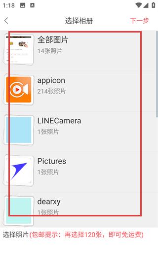 4、進入選擇相冊頁面,選中要沖印的照片所在相冊,勾選需要沖印的照片(滿120張可免運費)。