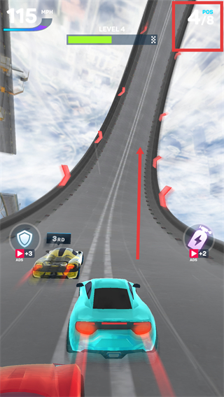 3、傾斜賽道靈活操控賽車,找準(zhǔn)時(shí)機(jī)超越【黃色賽車】,關(guān)注右上角排名位置全力提升名次。