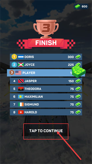 4、比賽完成后,點(diǎn)擊【TAP-TO-CONTINUE】,領(lǐng)取獎(jiǎng)勵(lì),繼續(xù)下一場(chǎng)賽車挑戰(zhàn)。