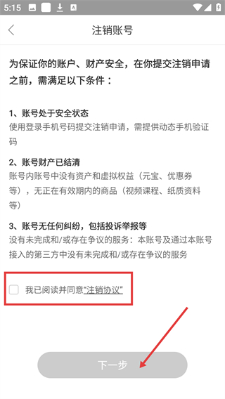 4、進入【注銷賬號】頁面后,需先勾選【我已閱讀并同意“注銷協(xié)議”】,滿足頁面列出的注銷條件后才能進行下一步操作。
