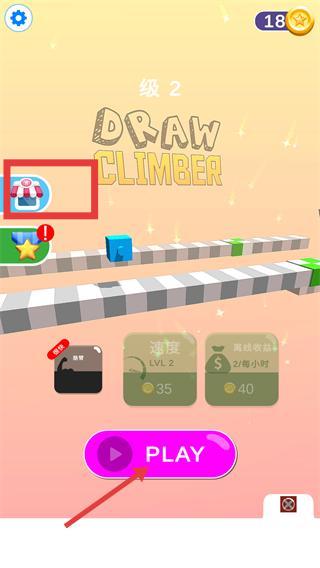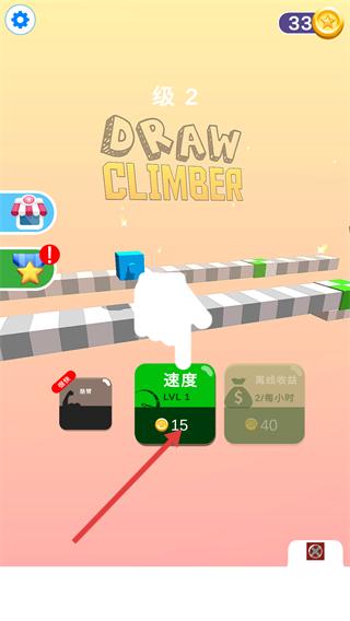1、在【級-2】的【DRAW-CLIMBER】界面,先升級【速度-LVL-1】至【15】,積累資源為購買裝備做準備。