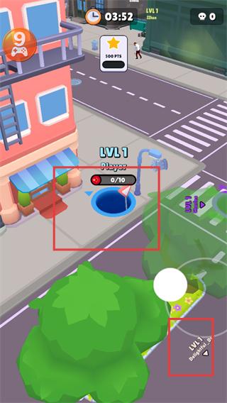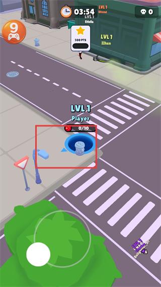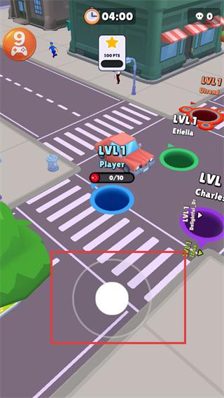 1、操控界面中的白色按鈕移動【LVL1-Player】黑洞,靠近物品可吞噬積累數值,同時留意【04:00】倒計時。