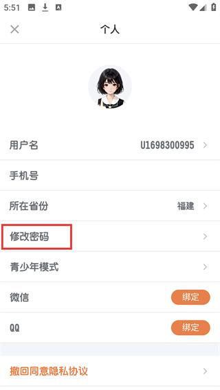 3、在個人信息頁面的選項列表里,找到【修改密碼】這一項并點擊,進入密碼修改的操作界面。