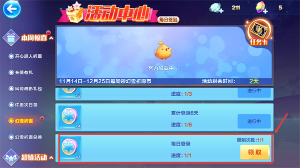 1、在【幻雪祈愿】活動中,完成每日登錄任務,進度達1/1時點擊【領取】按鈕,可獲取【幻雪祈愿幣】-x1。