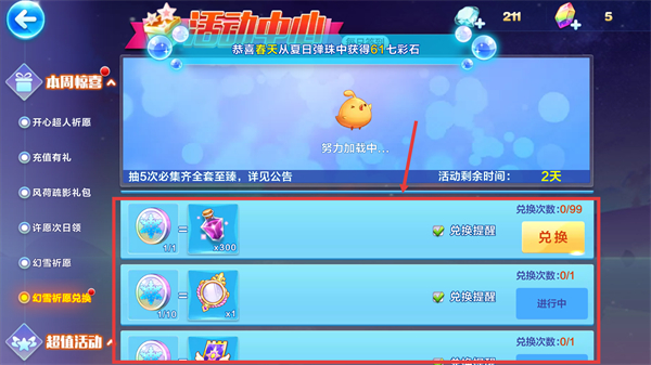 2、進入【幻雪祈愿兌換】界面,使用【幻雪祈愿幣】-x1可兌換【七彩石】-x300,留意兌換次數限制。