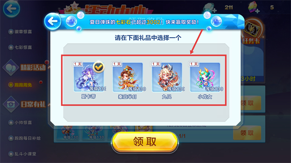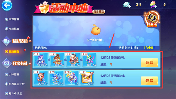 3、參與【跑跑周免】活動,于剩余13小時內完成登錄任務,點擊【領取】按鈕獲取周免角色。