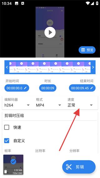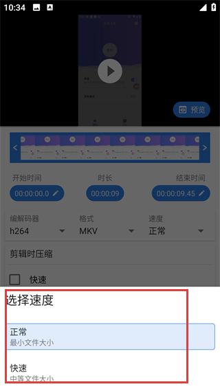 4、點(diǎn)擊【速度】選項(xiàng),選擇壓縮速度(如“最小文件大小”),調(diào)整視頻壓縮程度。