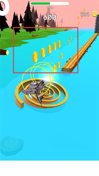 1、操控工具收集沿途金幣,同時觸發金色道具的增益效果,快速積累分數至【600】,金幣數達【326】。