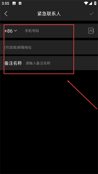 3、填寫【手機號碼】、【(可選填)郵箱地址】、【備注名稱】這些信息項,完成內容錄入。