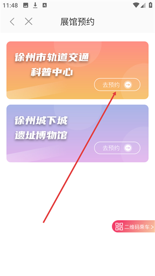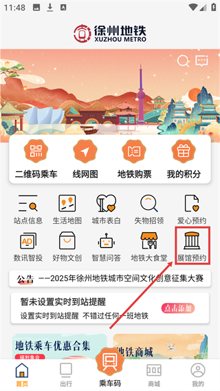 1、在【徐州地鐵】首頁找到【展館預約】功能按鈕并點擊,可進入展館預約的選擇頁面。