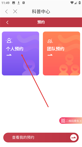 4、進入預約類型選擇頁面后,點擊【個人預約】選項,可進入個人維度的展館預約流程。