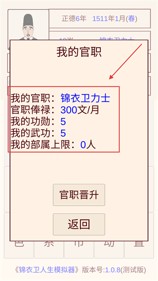 3、關注【我的官職】界面的功勛與武功值,通過南北鎮撫司任務提升數值,為官職晉升積累必要條件。