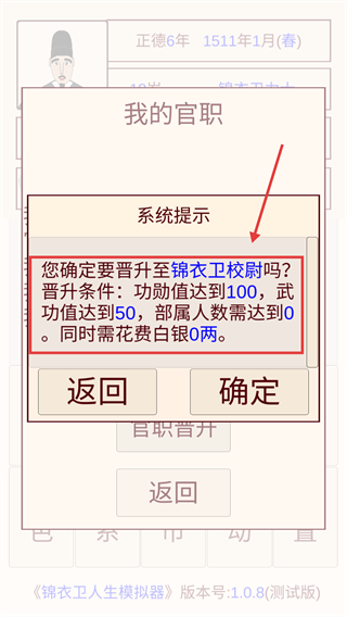 4、晉升【錦衣衛校尉】需滿足功勛100武功50等條件,先完成任務積累屬性,達標后點擊確定晉升官職。