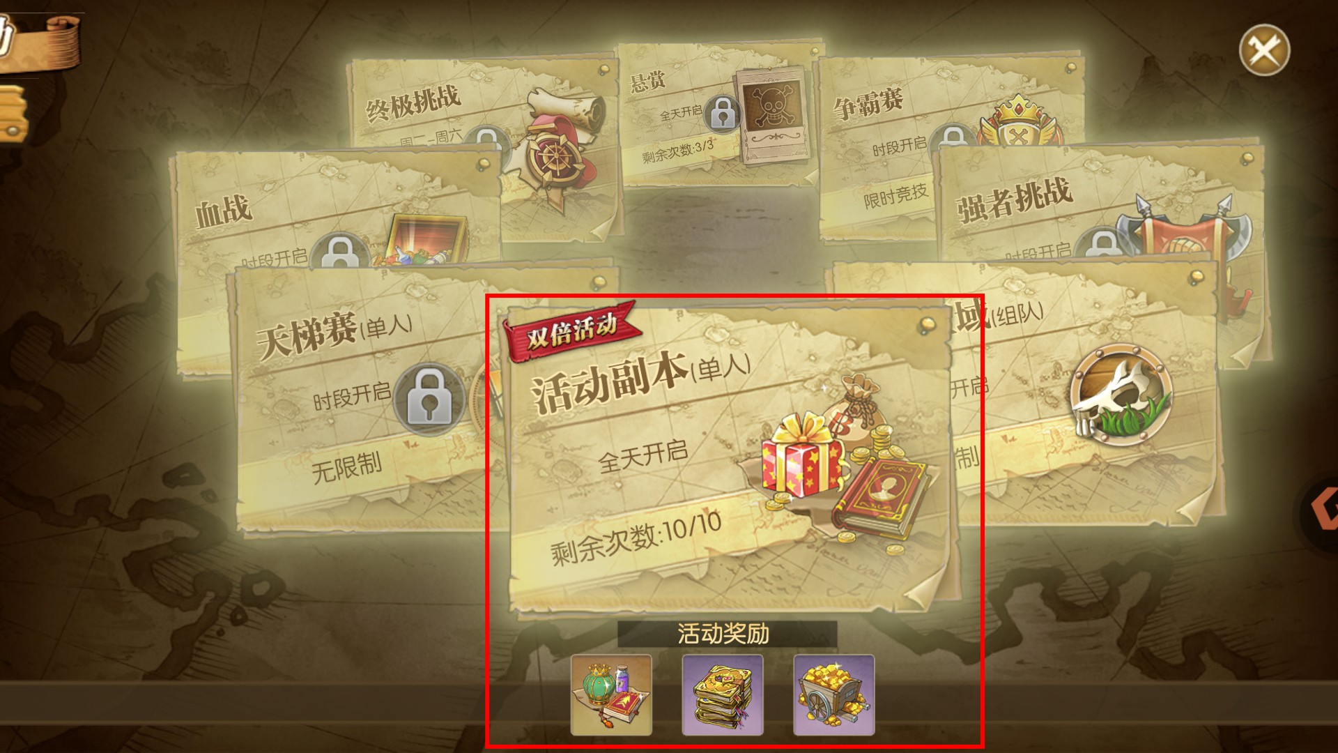 1、建議優先參與全天開啟的【雙倍活動-活動副本(單人)】,利用每日10次剩余次數,快速獲取豐厚的活動獎勵。