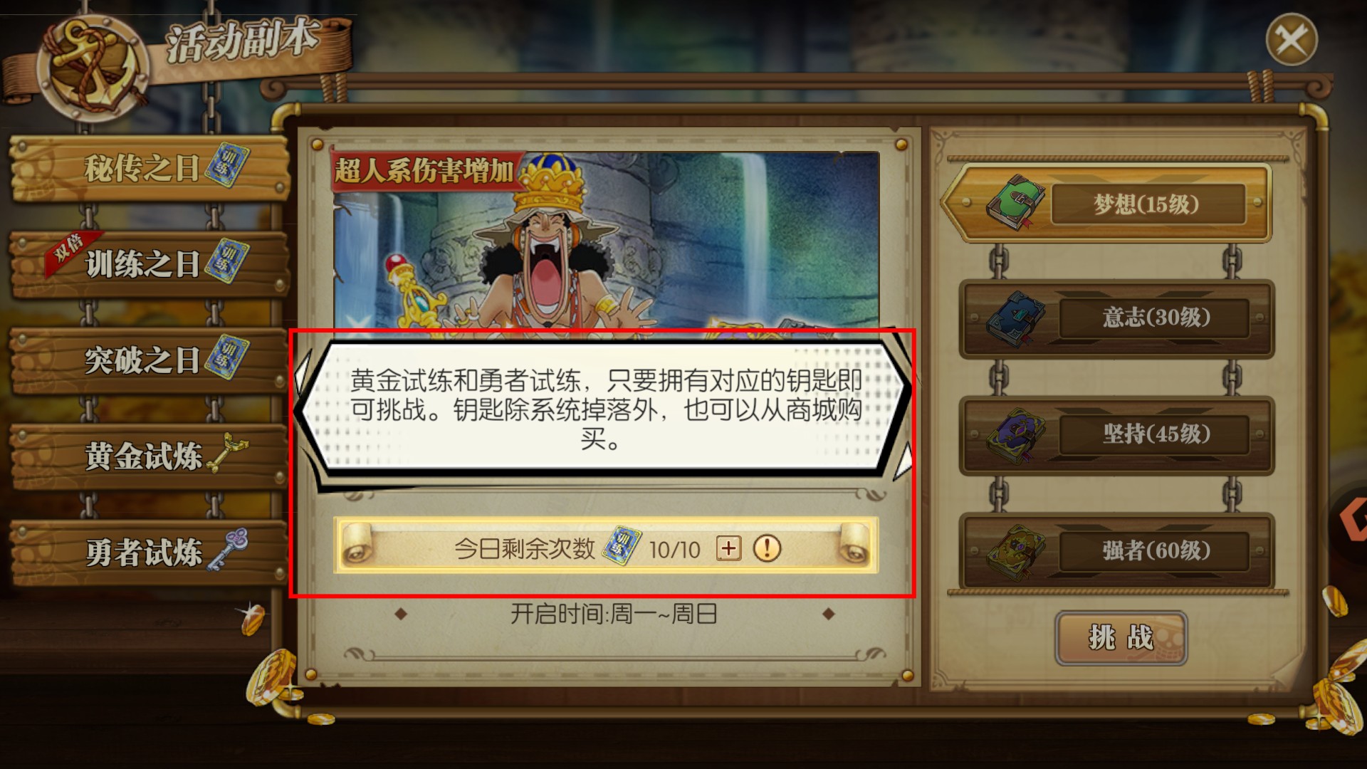 2、【秘傳之日】-【突破之日】-【訓練之日】三個副本難度分等級,等級越高獎勵越豐厚,建議優先提升角色戰力挑戰高等級。