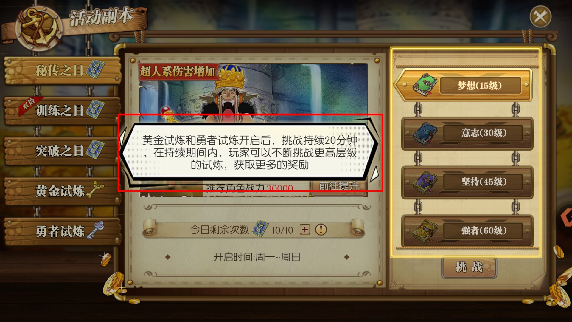 4、【黃金試煉】-【勇者試煉】開啟后持續20分鐘,期間可不斷挑戰更高層級,建議把握時間多次挑戰獲取更多獎勵。