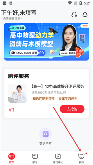 1、進入首頁,可查看直播課等內容,點擊底部【我的】進入個人中心頁面。