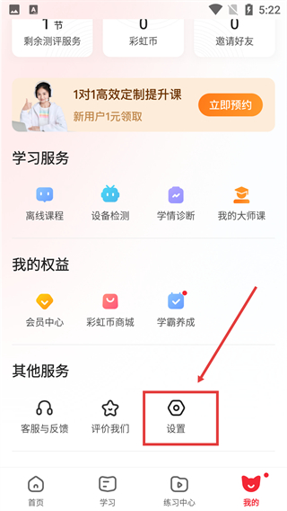 2、在個人中心頁,可查看學習服務等功能,找到【設置】選項,點擊進入設置管理頁面。
