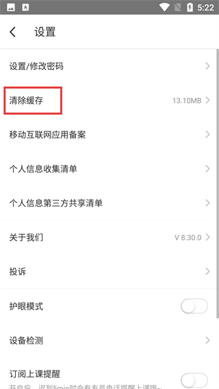 3、在設置頁面,可進行多項操作,找到【清除緩存】選項,點擊該選項觸發緩存清理確認彈窗。