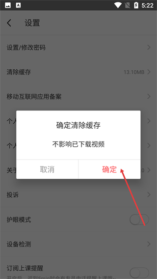 4、在彈出的【確定清除緩存】彈窗中,點擊【確定】按鈕,即可完成緩存清理操作且不影響已下載視頻。