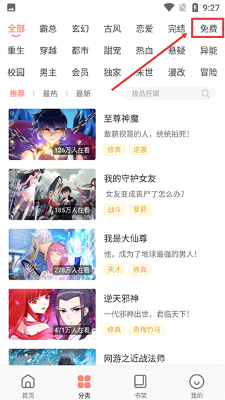 2、進入分類頁面后,點擊頂部的【免費】標簽,即可篩選出免費類的內容,方便查找想看的作品。