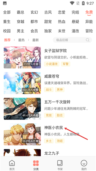 3、在【免費】分類下,找到【神醫(yī)小農民】作品并點擊。