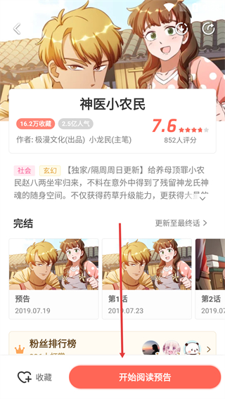 4、進入【神醫(yī)小農民】詳情頁,可查看作品的收藏-人氣等信息,點擊底部【開始閱讀預告】即可開啟閱讀。