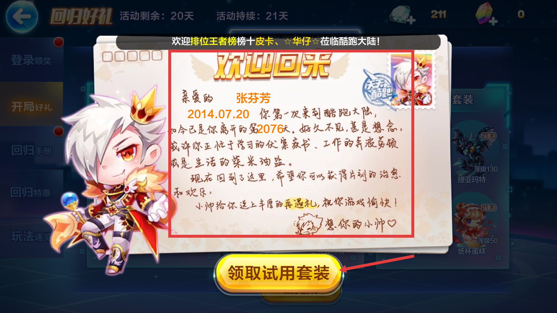 2、【歡迎回來】活動中,點擊領取試用套裝獲取強力角色,助力【張芬芳】快速適應游戲對局。
