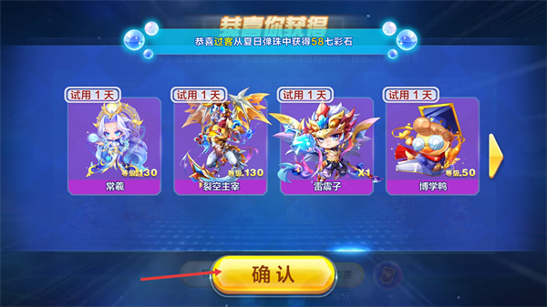 3、獲得【七彩石】及試用角色【常羲】-【裂空主宰】-【雷震子】-【博學鴨】,確認領取增強實力。