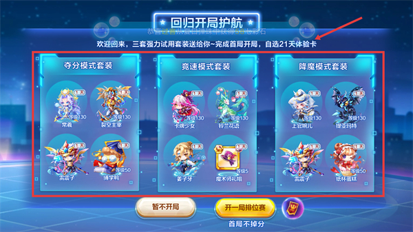 4、回歸開局護航有【奪分模式套裝】-【競速模式套裝】-【降魔模式套裝】,選套裝開啟對局提升體驗。