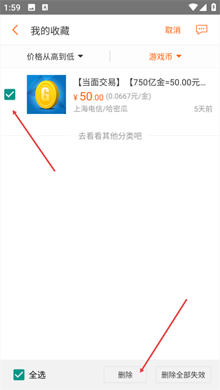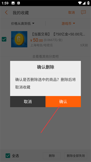 3、勾選需要?jiǎng)h除的收藏商品,隨后點(diǎn)擊底部的“刪除”按鈕,彈出確認(rèn)刪除的提示彈窗。