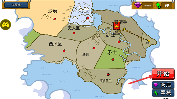 1、在地圖界面選擇【弓箭手】區(qū)域,點(diǎn)擊【開始】進(jìn)入關(guān)卡,可借助【商店】【軍械】準(zhǔn)備資源。