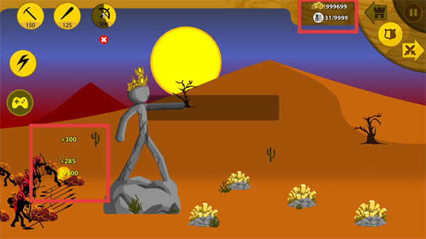 4、擊敗敵方單位后,可獲取【+300】【+285】等資源獎(jiǎng)勵(lì),提升資源數(shù)量至【31-9999】增強(qiáng)戰(zhàn)力。