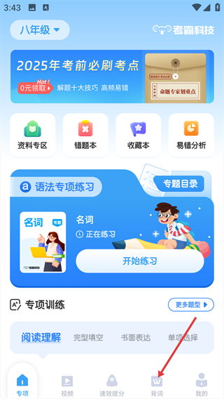 1、在專項頁面底部點擊【背詞】按鈕,進入【選擇詞書】界面。