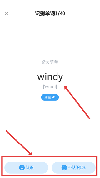 3、查看單詞及音標,根據熟悉程度選擇【認識】或【不認識】。