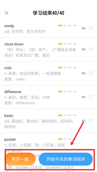 4、完成學習后,可以選擇【再學一組】繼續背詞,或點擊【開始今天的單詞闖關】進行單詞測試。