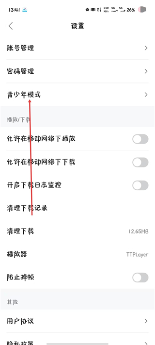 2、進(jìn)入設(shè)置操作界面,找到青少年模式并點(diǎn)擊。