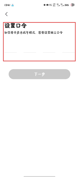 4、進(jìn)入設(shè)置口令頁(yè)面,輸入四個(gè)數(shù)字點(diǎn)擊下一步即可開(kāi)啟。
