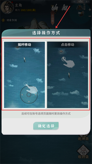 2、進(jìn)入游戲后選【搖桿移動(dòng)】或【點(diǎn)擊移動(dòng)】,建議按操作習(xí)慣選,后續(xù)能在賬號(hào)選項(xiàng)頁(yè)面隨時(shí)更改操作方式。