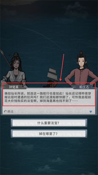 3、與【船工乙】對(duì)話時(shí)選【什么重要法寶?】選項(xiàng),了解法寶相關(guān)劇情信息,以此推進(jìn)當(dāng)前任務(wù)流程。