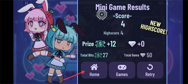 4、游戲結束后查看【Mini-Game-Results】,獲得【金幣】獎勵,點擊【Home】返回主界面。