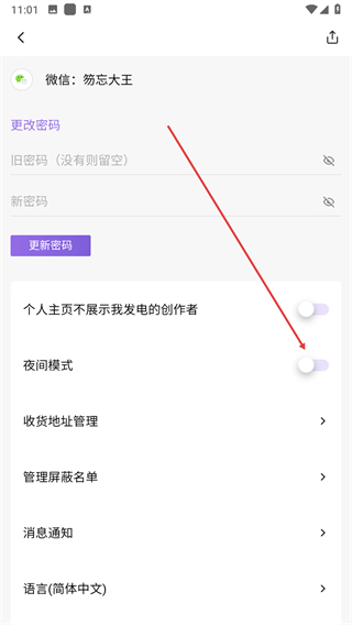 4、在設置頁面找到夜間模式選項,點擊開關。