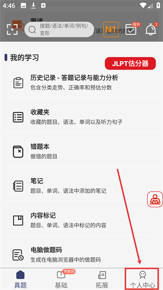 1、點擊底部導航欄的【個人中心】按鈕,從【真題】頁面跳轉至個人中心界面,可查看各類個人功能入口。