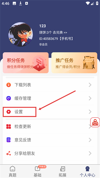 2、進入【個人中心】頁面后,找到【設置】選項并點擊,即可進入設置界面,查看各類系統配置選項。