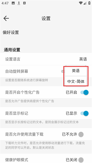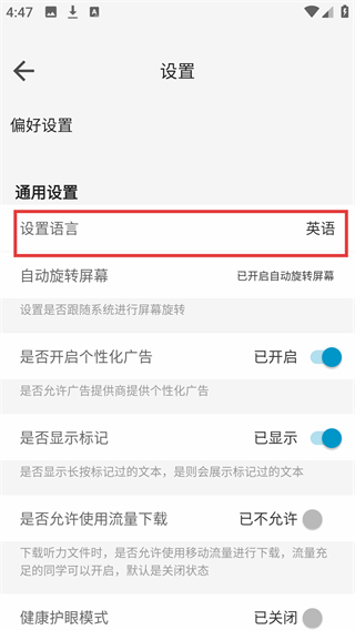 3、在【設置】頁面的【通用設置】板塊,找到【設置語言】選項,當前顯示為【英語】,點擊可展開語言選擇列表。