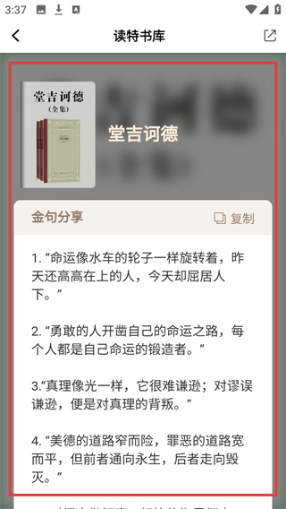 4、進入【堂吉訶德】書籍詳情頁,可查看該書的【金句分享】內容,還能進行復制等互動操作。