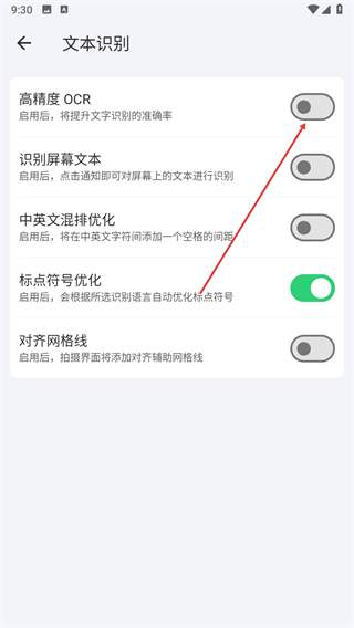4、在文本識別頁面,找到高精度OCR選項,點擊右側開關將其打開。