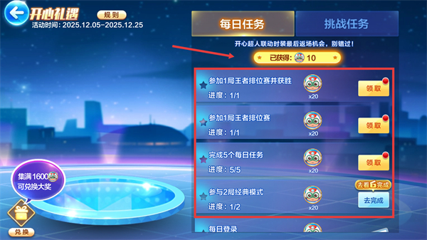 1、參與【開(kāi)心禮遇】活動(dòng)的【王者排位賽】任務(wù),完成后領(lǐng)取獎(jiǎng)勵(lì),積累道具可兌換【開(kāi)心超人聯(lián)動(dòng)時(shí)裝】提升體驗(yàn)。